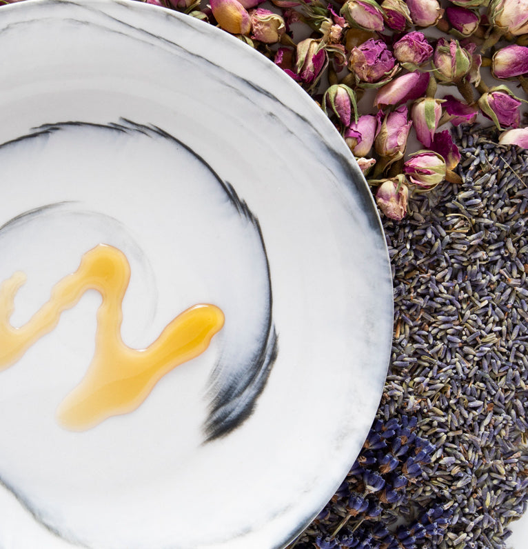 raw honey, rosewater, essential oils of lavender and ylang ylang.